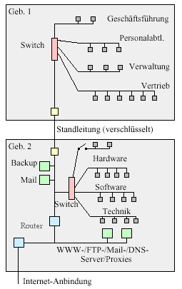 | Die Firma beispiel, Hard- und Softwareentwicklungen, möchte Internet-Anschluß. Das Unternehmen sitzt in zwei Gebäuden: |