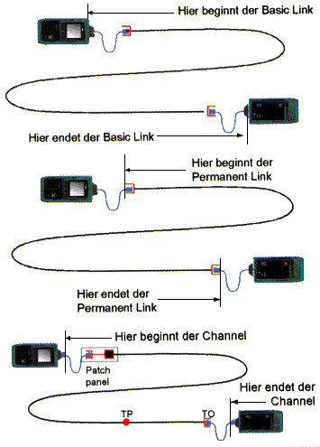 Inzwischen wird aber normkonform nur noch nach Permanent Link oder Channel gemessen. Bei der Permanent-Link-Messung (PL) darf der Einfluss der Messkabel nicht in die Messwerte eingehen. Damit belegt der Installateur seinem Auftraggeber die Funktion genau der Strecke, die er installiert hat, üblicherweise das fest verlegte Kabel inklusive der Dosen an beiden Enden. Die dritte Link-Definition, der Channel, schließt die Patchkabel mit ein, mit der die Endgeräte an die fest installierte Strecke angeschlossen werden. Bei dieser Messung wird der gesamte Übertragungsweg, über den die Netzkommunikation läuft, erfasst. Nicht in den Messwerten niederschlagen dürfen sich nach der normgemäßen Channel-Definition die Anteile der letzten Steckverbinder, mit denen die Patchkabel an die Messgeräte angeschlossen werden. Ein automatischer Test an einer Netzverkabelungs-Strecke schließt nach Norm die folgenden Messungen und Prüfungen ein: